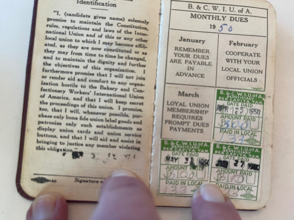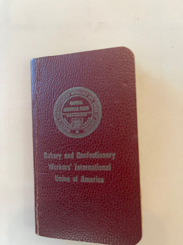 When he became a bakery owner his views on the union soured. The five top official of the International bakers union were indicted for embezzlement and conspiracy in 1958. After the AFL (craft unions) merged with the CIO (the industrial unions) in 1955 this new body expelled the baker’s union because of its reputation for embezzling and for requiring kickbacks from employers, also in 1958. The AFL-CIO set up a rival baker’s union, that fought tooth and nail with the original bakers’ union. That inter-union war lasted until 1978, when the rival bakers’ unions merged. The language in the union loyalty oath, “I furthermore promise that I will not join or render aid and comfort to any organization hostile to the Bakery and Confectionary Workers’ International Union of America, and that I will keep secret the proceedings of this union”, in the photo below can to be understood in the context of warding off any potential rival bakers’ unions.