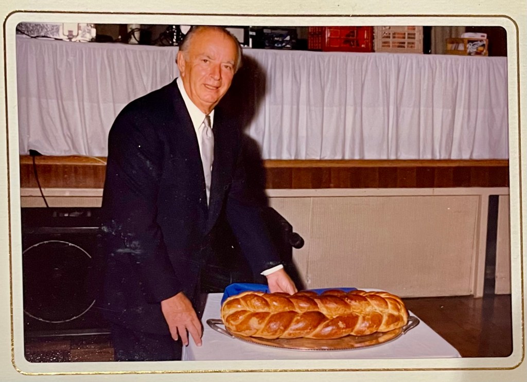 Below is a photo of my Dad saying the blessing for bread at our son’s Bar Mitzvah in 1988 over a large challah he had baked. The second photo is of me with a challah at my grandson’s bar mitzvah in 2024. The third photo is of me doing the same thing at my nephew’s wedding with a large challah I had baked in 2015. The last photo is Dad teaching our daughter and her fiancé how to make bread in 2001.